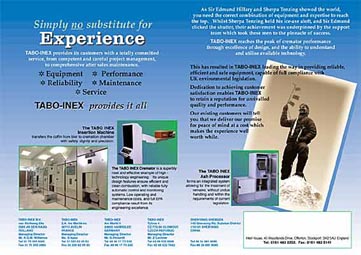 Neil McAllister's photographic skills have been used for many advertisements, appearing in magazines, such as 'Vogue' and on street hoardings. We are also able to design and produce your advertisements.This double-page advertisement was produced for Cremator manufacturer Tabo-Inex, using Neil McAllister's location photography, and a picture library picture of the Sherpa Tenzing memorial in Darjeeling.